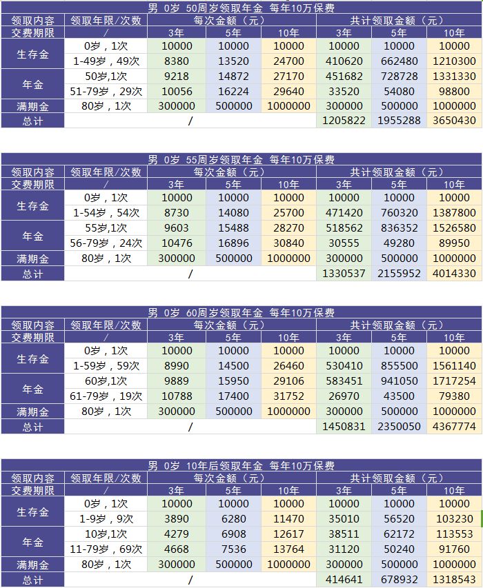 保鱼君举个栗子具体说明一下。以0岁的男性小明为例,每年保费10万,60岁领取年金,则: